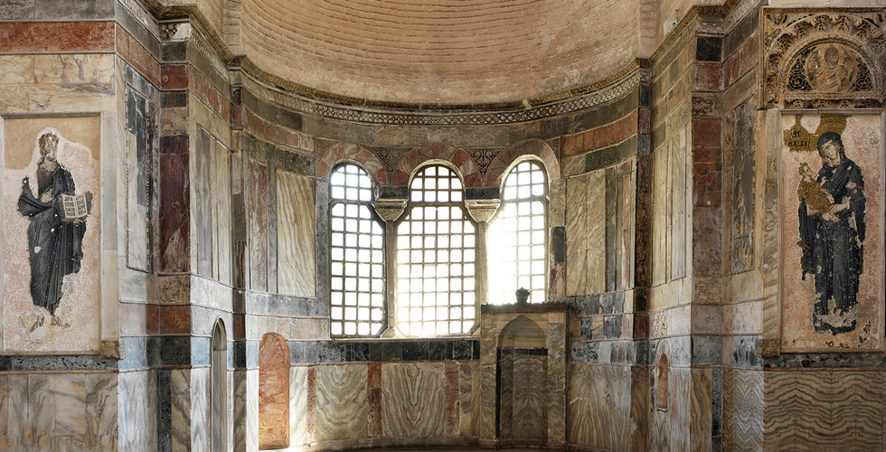Iconostasis: Usually what you’re staring at as soon as you enter the nave, this was historically known as a templon i.e. a screen, typically made of marble that divided nave from sanctuary. Originally a low and open parapet, by the thirteenth century it had sprouted colonettes and an epistyle from which icons could be hung, taking it from a symbolically liminal feature to a very real wall. If you’ve seen enough of them, you’ll have noticed a pattern. At the top level are the patriarchs; below them, the prophets (with Mary and Christ centre stage presenting the summation of their prophecies); below them, the events of the New Testament; below them, Christ with John the Baptist, Mary, Apostles and Angels praying; below these, the doors, which often have scenes from the Last Supper above them.